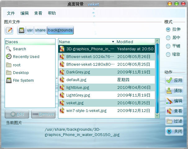 veket系统给桌面添加图标的方式还算是简单的。 i)添加快捷方式 如果是添加你自己的目录、文件、图片等,直接从文件管理器(随便那个文件管理器都可以的)拉到桌面就可以了。注意,如果是目录快捷方式的话,点击图标跳出的将会是rox文件管理器(不是thunar)。 如果你需要添加应用程序快捷方式,去这个目录: /usr/share/applications/ 如果是veket-5系列,还可以去这里: /usr/share/Utility8/ 这两个目录里面有很多.desktop文件。在veket里,每个应用程序都会有这样一个文件,有了它应用程序才会出现在系统菜单里。选中你要的应用程序,拉到桌面就可以了。 当然,你还可以去一些可执行程序所在的目录直接拉可执行程序。一般来说,linux里以“bin”命名的目录都是放可执行程序或脚本的。 桌面快捷方式建立以后,这些快捷方式会被记录在这个文件: /root/Choices/ROX-Filer/PuppyPin 你可以用文本编辑器打开这个文件,你可以看到桌面壁纸和快捷方式都在里面记录着。壁纸的记录是这样的: <backdrop style="Stretched">/usr/share/backgrounds/3D-graphics_Phone_in_water.jpg</backdrop> 前面的“style=”定义图片使用的方式,我这里是"Stretched",就是“拉伸”。后面部分就是我用的壁纸的路径和图片文件名。 每一个快捷方式在PuppyPin中都会有一条记录,像这样: <icon x="1214" y="716" label="pfind">/usr/share/applications/pfind.desktop</icon> “x=”定义图标在屏幕上的x轴坐标。“y=”是y轴坐标,“label=”定义快捷方式的的名称,后面的路径和文件名就是我拉到桌面的应用程序pfind的.desktop文件。 你可以编辑这个PuppyPin文件,随便修改,不会有大问题的。顶多就是壁纸、图标消失了,没啥大不了,把文件改回去就好了。 对于那些较小分辨率的屏幕,系统默认的标准界面(1024x768)可能会让一部分桌面图标和wbar重叠,解决办法有二: 第一个方法 - 开wbar精灵,先“取消”wbar,wbar消失,然后你就可以随意拖动桌面图标到合适的位置。然后再回到wbar精灵界面,或重新设置你要的wbar,或恢复默认wbar。这个方法的好处是简单,坏处是如果图标超出屏幕就无法修正。所以有第二个方法 第二个方法 - 在上面提到的/root/Choices/ROX-Filer/PuppyPin文件里修改,例如你的分辨率是800x600的,那你就在这个文件中,把所有类似y="716"这种数字较大的都改掉,数字改小,改成类似y="450"这种,把所有类似x="1000"这种也改小,改成小数,类似x="700",然后点任务条左边(系统菜单按钮右边)的快捷菜单,里面有个重启桌面的项,重启一下桌面,图标就都往中间跑了,然后就可以拖拉到合适位置。 ii)编辑桌面快捷方式 对桌面的图标点鼠标右键,会有菜单出来 登录/注册后可看大图 常用的有: 移除项目:意思就是删除这个快捷方式。 显示位址:点一下就会跳出个rox文件管理器的界面,里面就是你这个快捷方式所指的文件。 编辑项目:这是界面 登录/注册后可看大图 可以修改图标下的文字(默认是原文件名),如果是可执行文件(例如你从bin目录拉出来的快捷方式)可以在这里把参数写上,这样每次运行都会带上参数(由衷感叹:rox的确是小而强)。 文件'xxxx':这是个子菜单,里面常用的有“设定图标”,你可以对这一个快捷方式定义图标,也可以对整个文件类型(例如png格式的图片)定义图标。只要在文件管理器里找个图标拖进界面里面就可以了(怎么找图标?本教程会告诉你一些图标目录,到图标目录去找)。如果你不设置图标,那么图标将呈现系统默认的状态,应用程序的图标由.desktop文件定义,而文件、目录的快捷方式显示这个目录里的图标: /usr/local/apps/ROX-Filer/ROX/MIME/ 如果你不喜欢某个文件类型的图标,找个图标替换就行了。 ROX-Filer:这是个有关rox文件管理器的子菜单,你可以点击里面的“选项”,在选项里定义快捷方式是双击还是单击启动。还有一些其他的设置(如果你平时不用rox文件管理器就没什么用了) 桌面快捷方式右键菜单还有一些其他的功能,有空可以自己去摸索。